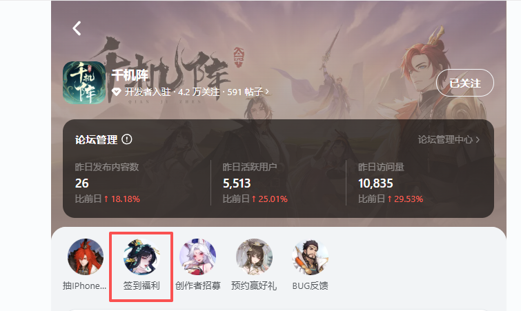 论坛《千机阵》社区参与签到活动,领取游戏礼包福利哦!