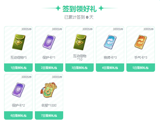 签到奖励:互动信物、保护卡、换将卡、手气卡、名望等
